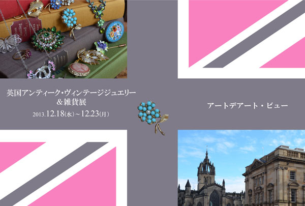 英国アンティーク・ヴィンテージジュエリー&雑貨展 英国展シリーズの第3回目です 今回もアンティーク・ヴィンテージジュエリー&雑貨は直接英国より持ち帰ったものばかり どうぞお早めにお越しください☆ 「午後のティータイム」 12月20日(金)・21日(土)午後 1 時~4時 茶菓代 500円 イングリッシュティーと英国からのクリスマス菓子でお待ちしております 2013年12月18日(水)~12月23日(月) open 11:00~18:00 (最終日17:00まで)