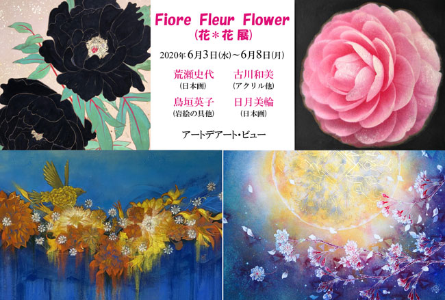 Fiore Fleur Flower(花々展) ☆ Fiore Fleur Flower 2020年6月3日(水)~6月8日(月) 状況により期間変更あります 12:00~17:00 <最終日17:00まで> 営業時間を変更しています 荒瀬史代 (日本画)鳥垣英子 (岩絵の具)日月美輪 (日本画)古川和美 (アクリル他)