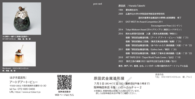 原田武 金属造形展 Takeshi Harada Solo Exhibition 2023年 7月5日(水) ~ 7月11日(火) 10:00~20:00 <最終日は午後5時まで> 阪神梅田本店 8階: ハローカルチャー2 高槻のギャラリーは期間中休廊