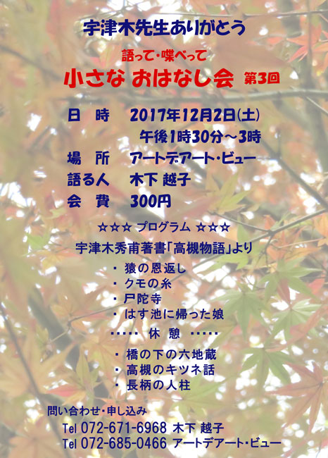 語って・喋って 小さな おはなし会 第3回 ☆ 宇津木先生ありがとう 語って・喋って 小さな おはなし会 第3回 日時:2017年12月2日(土)午後1時30分~3時 場所:アートデアート・ビュー 語る人:木下越子 会費:300円 ◇プログラム◇ 宇津木秀甫著書「高槻物語」より 猿の恩返し/クモの糸/尸陀寺/はす池に帰った娘 橋の下の六地蔵/高槻のキツネ話/長柄の人柱