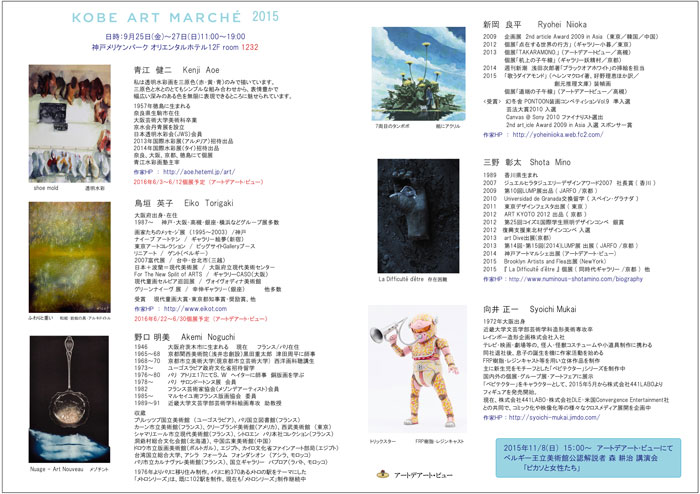 神戸アートマルシェに出展します!☆ KOBE ART MARCHÉ 神戸メリケンパーク オリエンタルホテル 12階 room 1232 青江健二 鳥垣英子 野口明美 新岡良平 三野彰太 向井正一 2015年9月25日(金)~ 9月27日(日)