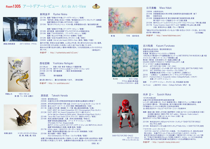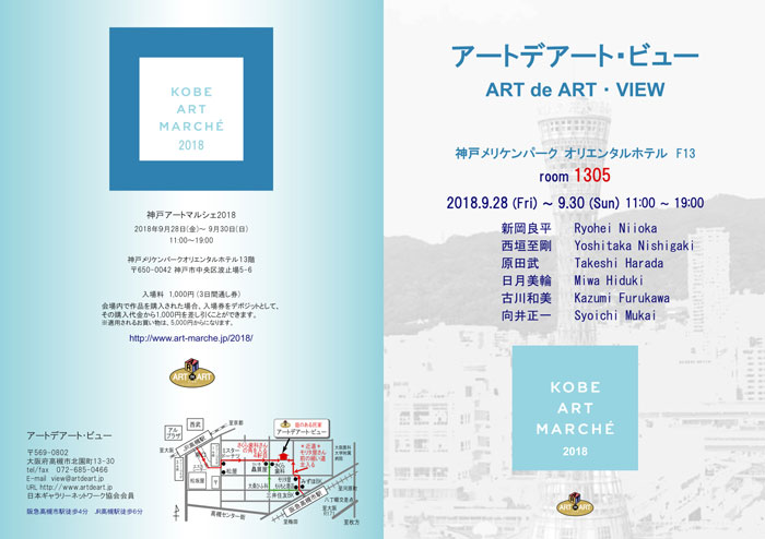 神戸アートマルシェ2018 出展 ☆ 神戸メリケンパークオリエンタルホテル13階 Room 1305 新岡 良平 Ryohei Niioka 西垣 至剛 Yoshitaka Nishigaki 原田 武 Takeshi Harada 日月 美輪 Miwa Hiduki 古川 和美 Kazumi Furukawa 向井 正一 Syoichi Mukai 2018年9月28日(金)~ 9月30日(日) 11:00 - 19:00