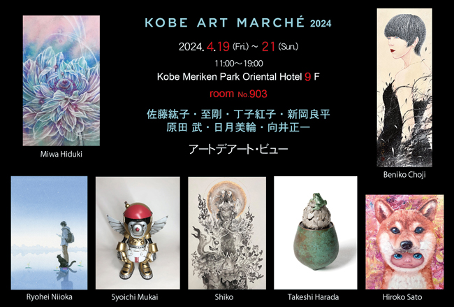 KOBE ART MARCHÉ 2024 Kobe Meriken Park Oriental Hotel 9F Room No.903 出品作家 佐藤紘子・至剛・丁子紅子・新岡良平 原田武・日月美輪・向井正一 神戸アートマルシェ 2024 神戸メリケンパークオリエンタルホテル 9 階 Room No.903 2024年 4月19日(金) ~ 4月21日(日) 11:00~19:00 高槻のギャラリーは期間中休廊