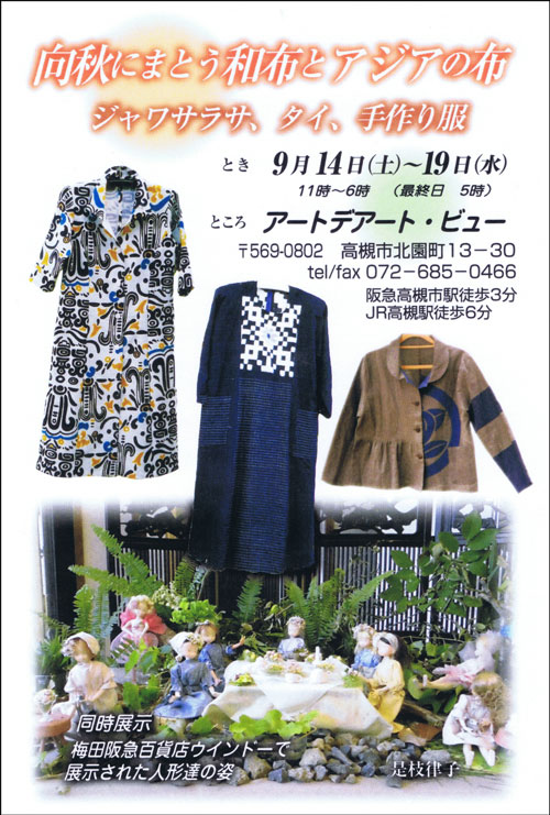 是枝 律子 作品展 -向秋にまとう和布とアジアの布 ジャワサラサ、タイ、手作り服- 2013年9月14日(土)~9月19日(木) open 11:00~18:00 (最終日17:00まで 会期中無休)