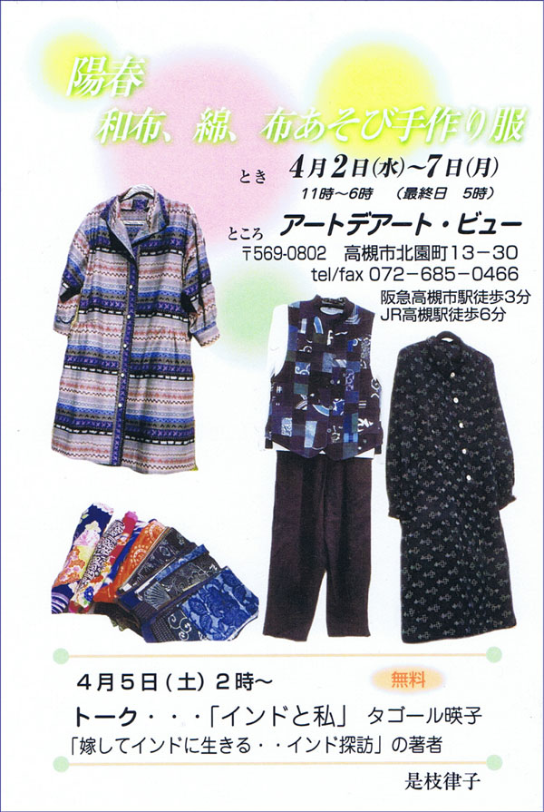 是枝律子 作品展 陽春 和布、綿、布あそび手作り服 2014年4月2日(水)~4月7日(月) open 11:00 - 18:00 (最終日17:00まで) 4月5日(土)午後2時~ トーク・・・「インドと私」タゴール暎子 <「嫁してインドに生きる・・インド探訪」の著者>