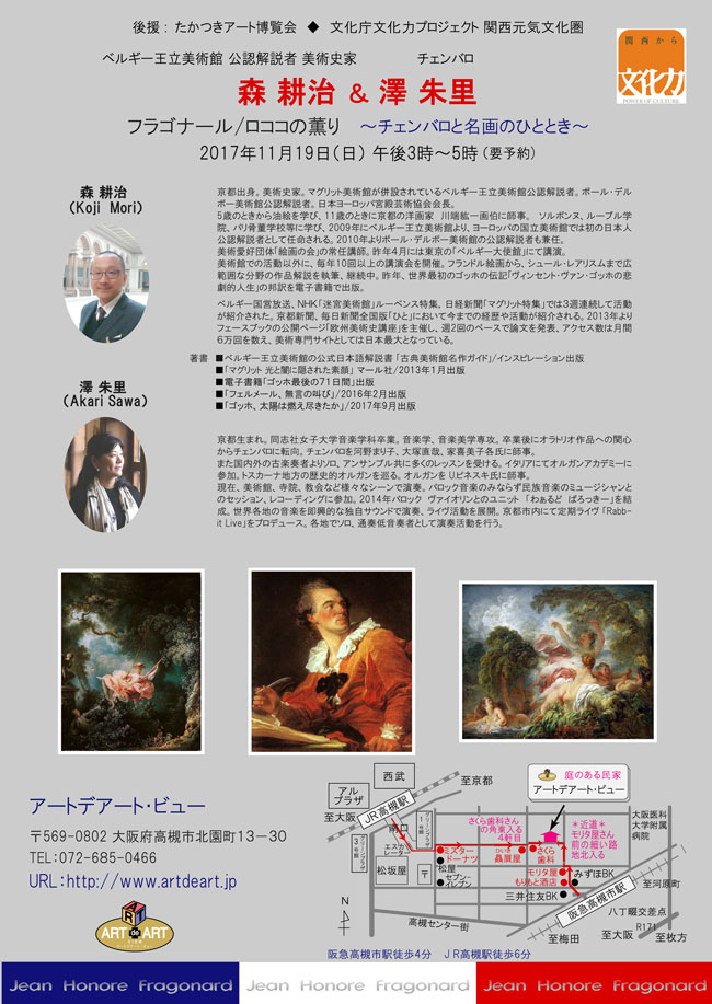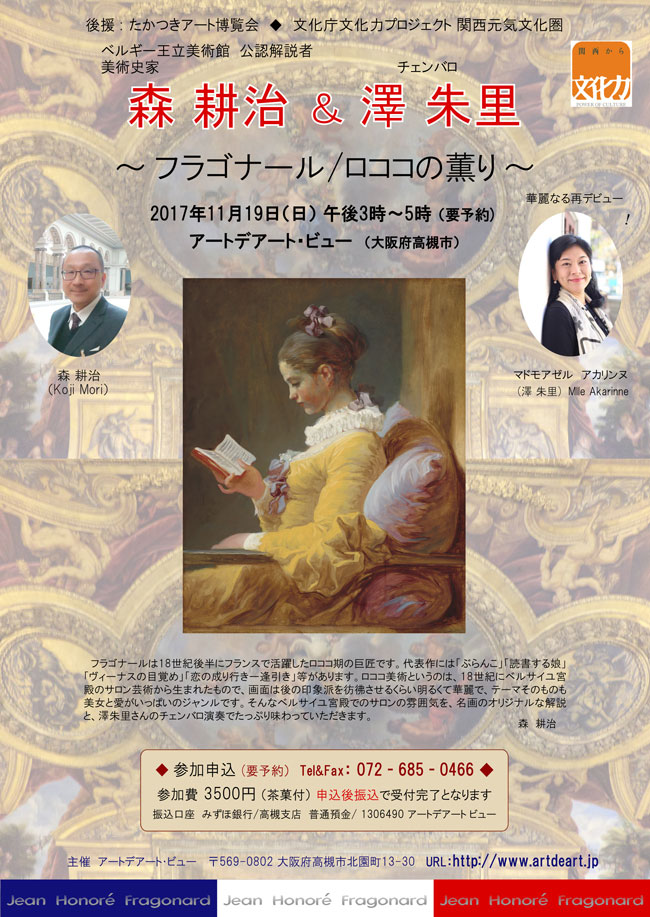 森 耕治 & 澤 朱里 ☆ フラゴナール/ロココの薫り ~チェンバロと名画のひととき~ 2017年11月19日(日) 午後3時~5時 参加申込 (要予約)tel&fax 072-685-0466 参加費 3500円 (茶菓付)申込後振込で受付完了となります