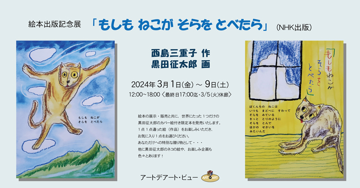 絵本出版記念展「もしも ねこが そらを とべたら」 「もしも ねこが そらを とべたら」(NHK出版) 絵・黒田征太郎 文・西島三重子 2024年 3月1日(金) ~ 3月9日(土) 12:00~18:00 <最終日は17:00迄・3/5(火)休廊>