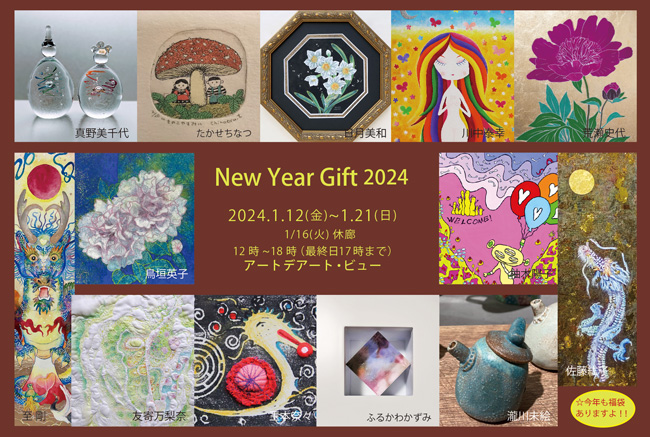 New Year Gift 2024 荒瀬史代・川中泰幸・佐藤紘子・至剛・たかせちなつ 瀧川未絵・玉本奈々・友寄万梨奈・鳥垣英子 日月美輪・ふるかわかずみ・真野美千代・柚木陽子 2024年 1月12日(金) ~ 1月21日(日) 12:00~18:00 <最終日は17:00迄・16日(火)休廊>