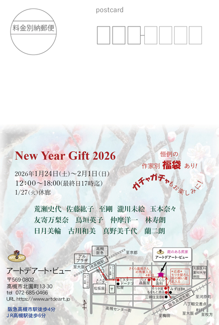 New Year Gift 2026 荒瀬史代 佐藤紘子 至剛 瀧川未絵 玉本奈々 友寄万梨奈 鳥垣英子 仲摩洋一 林寿朗 日月美輪 古川和美 真野美千代 蘭二朗 2026年1月24日(土) ~ 2月1日(日) 12:00~18:00 <最終日は17:00迄・1/27(火)休廊> 恒例の作家別*福袋*あり! ガチャガチャもお楽しみに!