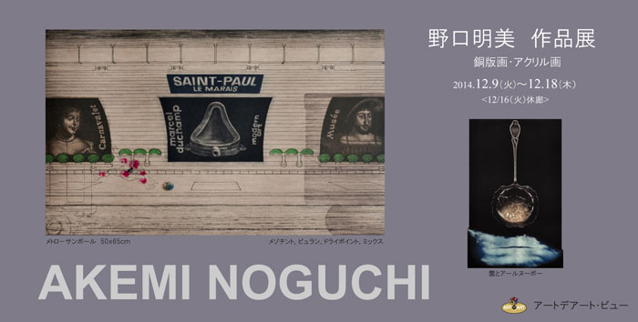 野口明美 作品展 銅版画・アクリル画 1976年よりパリに移り住み制作。パリに約370あるメトロの駅をテーマにした「メトロシリーズ」は、 既に102駅を制作。現在も次々と駅をテーマに制作継続中。他にメゾチント「雲シリーズ」も制作。 2014年12月9日(火)~ 12月18日(木) [12/16(火)休廊] open 11:00 - 18:00 <最終日17:00まで>