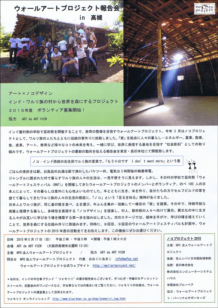 ☆ノコプロジェクト報告会ツアー ~インドで家を建てました~ ☆日程 5月17日(日)午後2時~午後5時 *開場:午後1時30 ☆参加費 500円 ドリンク(インドのチャイ)つき ☆2015年2月~3月に繰り広げられたノコプロジェクト in ワルリの村での 出来事とこれからを、映像や写真展示トークでみなさまにお伝えします。 時には参加者とのディスカッションも*ぜひお誘いあわせてご参加ください!