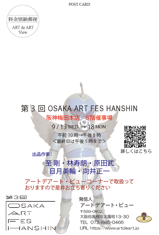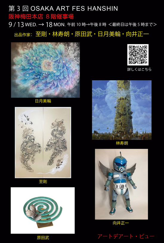 第3回OSAKA ART FES HANSHIN OSAKA ART FES HANSHIN 阪神梅田本店 8階催事場 9 / 13 WED. → 18 MON. 10:00~20:00 <最終日は午後5時まで> 出品作家:至剛・林寿朗・原田武・日月美輪・向井正一 高槻のギャラリーは期間中休廊