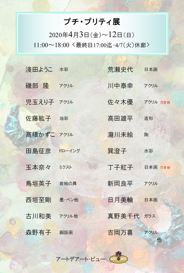 玉本奈々(ミクスト)、丁子紅子(日本画)new、鳥垣英子(岩絵の具)、新岡良平(アクリル)、