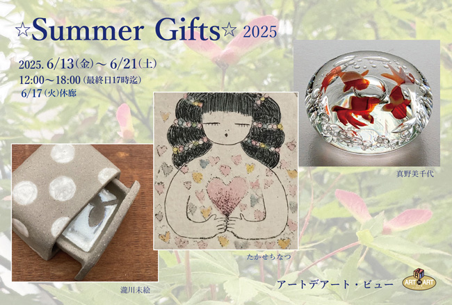 Summer Gifts 2025 たかせちなつ(銅版画・布小物) 瀧川未絵(陶) 真野美千代(ガラス) 2025年6月13日(金) ~ 6月21日(土) 12:00~18:00 <最終日は17:00迄・6/17(火)休廊>