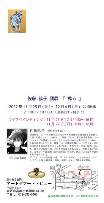 佐藤 紘子 個展 Hiroko Sato solo exhibition 『 視る 』 -ライブペインティング- 11月25日(金) 14時~16時 11月27日(日) 14時~16時 2022年11月25日(金)~12月4日(日) 12:00~18:00 <最終日17:00まで・11/29(火)休廊>