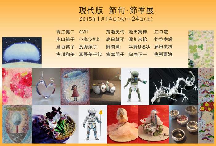 現代版 節句・節季展 *日本に古来から伝わる節句・節季を現代の作家がどの ように表現するのか? 楽しい試みの展覧会です。* 青江健二 AMIT 荒瀬史代 池田実穂 江口宏 奥山純子 小高ひさよ 高田雄平 瀧川未絵 釣谷幸輝 鳥垣英子 長野順子 野間薫 平野はるひ 藤田史枝 古川和美 真野美千代 宮本朋子 向井正一 毛利憲治 他 2015年1月14日(水)~ 1月24日(土) [1/20(火)休廊] open 11:00 - 18:00 <最終日17:00まで>
