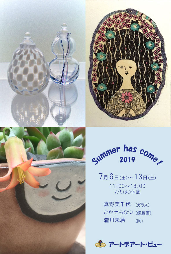 Summer has come!! ☆ たかせちなつ 銅版画 瀧川未絵 陶 真野美千代 ガラス 2019年7月6日(土)~ 7月13日(土) 11:00 - 18:00 <最終日17:00まで・7/9(火)休廊>