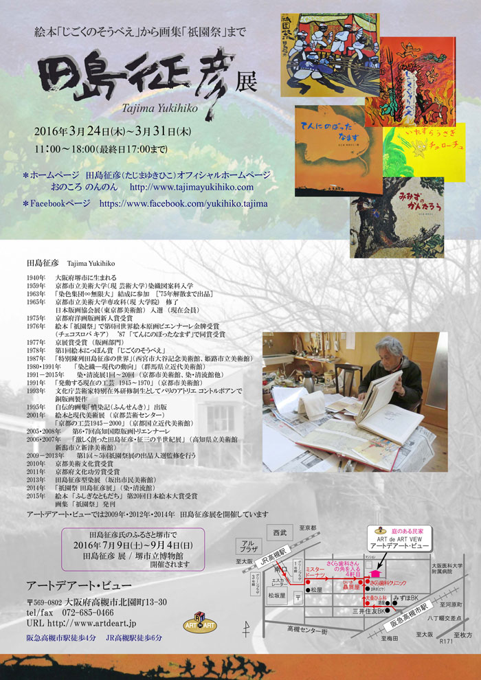 田島 征彦 展☆ ~絵本「じごくのそうべえ」から画集「祇園祭」まで~ 2016年3月24日(木)~ 3月31日(木) 11:00 - 18:00 <最終日17:00まで> *お話し会 日時:3月27日(日) 14:00~15:30 お話と絵本の読み聞かせ お買上絵本のサイン会 参加費 500円 要予約 Tel 072-685-0466