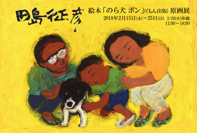 田島征彦 「のら犬 ボン」 原画展 ☆ 「のら犬 ボン」(くもん出版) 原画展 2018年2月15日(木)~2月25日(日) 11:00 - 18:00 <最終日17:00迄・2/20(火) 休廊> ☆田島征彦 絵本の読み語りとお話 2/17(土)午後2時~3時(要予約) 参加費 500円 終了後絵本サイン会あり☆