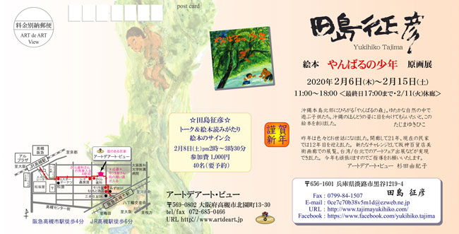 田島征彦 絵本 やんばるの少年 原画展 ☆ 絵本 やんばるの少年 2020年2月6日(木)~ 2月15日(土) 11:00 - 18:00 <最終日17:00まで・2/11(火)休廊> ☆ 田島征彦トーク&絵本読みがたり 2月8日(土) pm2時~3時30分 参加費1000円 40名(要予約)