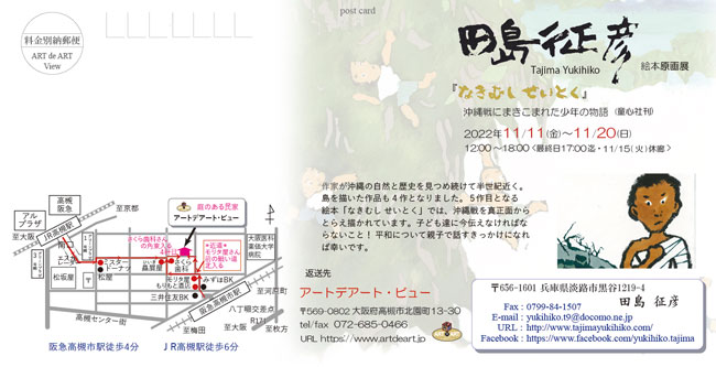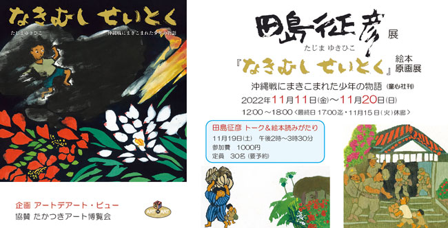 田島 征彦 展 ☆ 「なきむし せいとく」絵本原画展 沖縄戦にまきこまれた少年の物語 (童心社刊) ☆ 田島征彦 トーク&絵本読みがたり ☆ 11月19日(土) 午後2時~3時30分 参加費 1000円 定員 30名 (要予約) ☆-- トークイベント中止のお知らせ -- 11月19日(土)のトークイベントは作家都合により中止とさせていただきます。 2022年11月11日(金)~11月20日(日) 12:00~18:00 <最終日17:00まで・11/15(火)休廊>