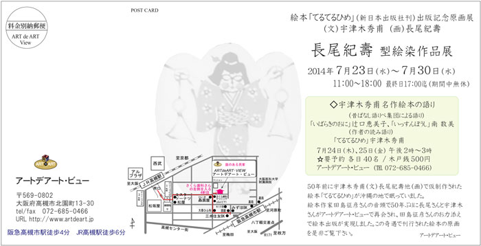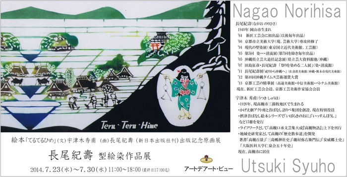 (新日本出版社刊)出版記念原画展 ◇絵本 「てるてるひめ」 (文)宇津木秀甫 (画)長尾紀壽 ◇長尾紀壽 型絵染作品展 2014年7月23日(水)~7月30日(水) open 11:00 - 18:00 <最終日17:00まで/期間中無休>