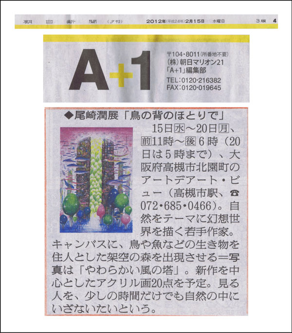 ★トピックス ☆尾崎潤 個展 ☆ 朝日新聞 2012年2月15日(水) (夕刊) A+1に掲載されました