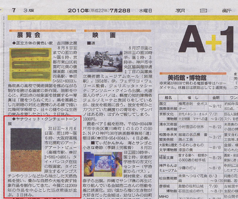 ★トピックス ☆ヤナウィット・クンチェートーン展 ☆ 朝日新聞 2010年7月28日(水) (夕刊) A+1に掲載されました