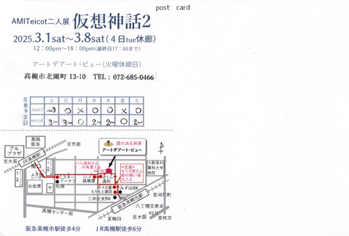 AMIT eicot二人展 仮想神話 2 2025年3月1日(土) ~ 3月8日(土) 12:00~18:00 <最終日は17:00迄・3/4(火)休廊> 作家在廊予定 AMIT: 3/1(土)午後3時迄, 3/2(日), 3/5(水), 3/6(木), 3/8(土) eicot: 3/1(土)午後3時~, 3/2(日)午後3時~, 3/3(月),3/5(水)午後2時~, 3/6(木) 午後2時~, 3/7(金), 3/8(土)午後2時~